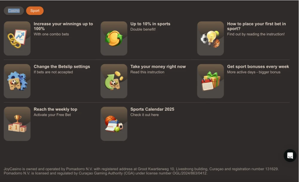 Email support is available at support@joycasino.com for less urgent matters. Response times typically range within a few hours. They also maintain an extensive FAQ section covering common topics like registration, bonuses, games, deposits, withdrawals, and account management.